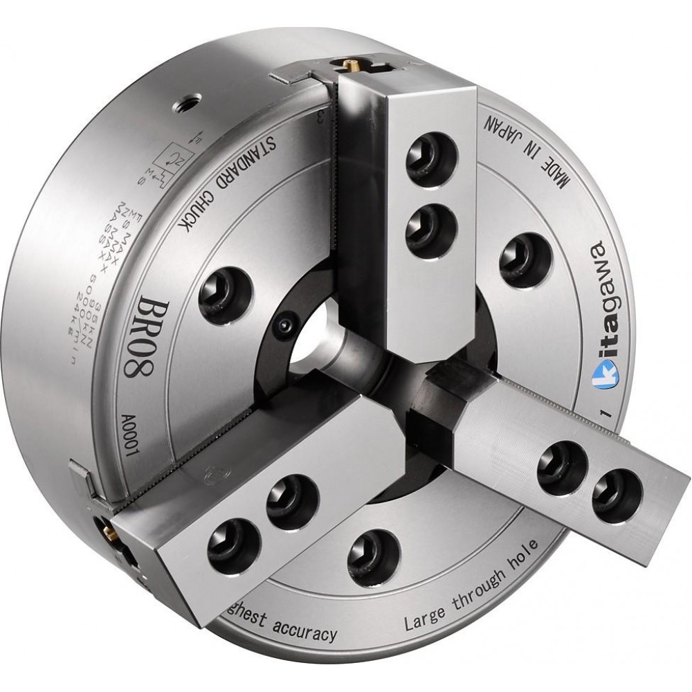 Kitagawa BR12 — это вершина линейки высокоточных патронов. Диаметр 304 мм и сквозное отверстие 91 мм позволяют работать с самыми массивными заготовками, сохраняя при этом ювелирную точность. Эта модель незаменима на предприятиях, специализирующихся на тяжелом машиностроении, где изготавливаются большие фланцы, диски и корпусные детали.